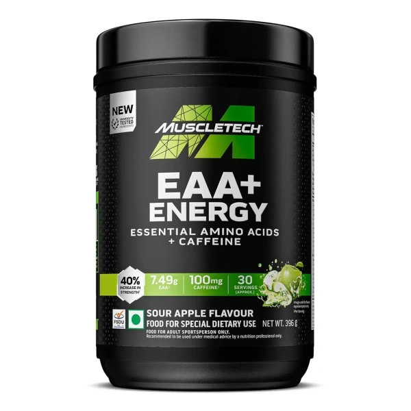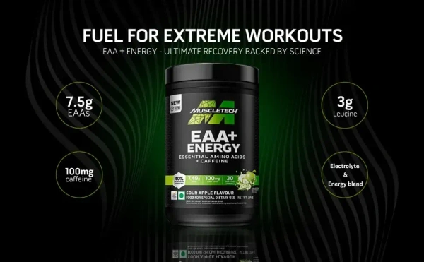 MuscleTech Eaa + Energy | Essential Amino Acids + 100Mg Caffeine | Replenish Electrolytes | Ultimate Recovery 7.4 grams Eaa | 4.5 grams Bcaa | 3 grams Leucine | 30 Servings | Sour Apple, Powder